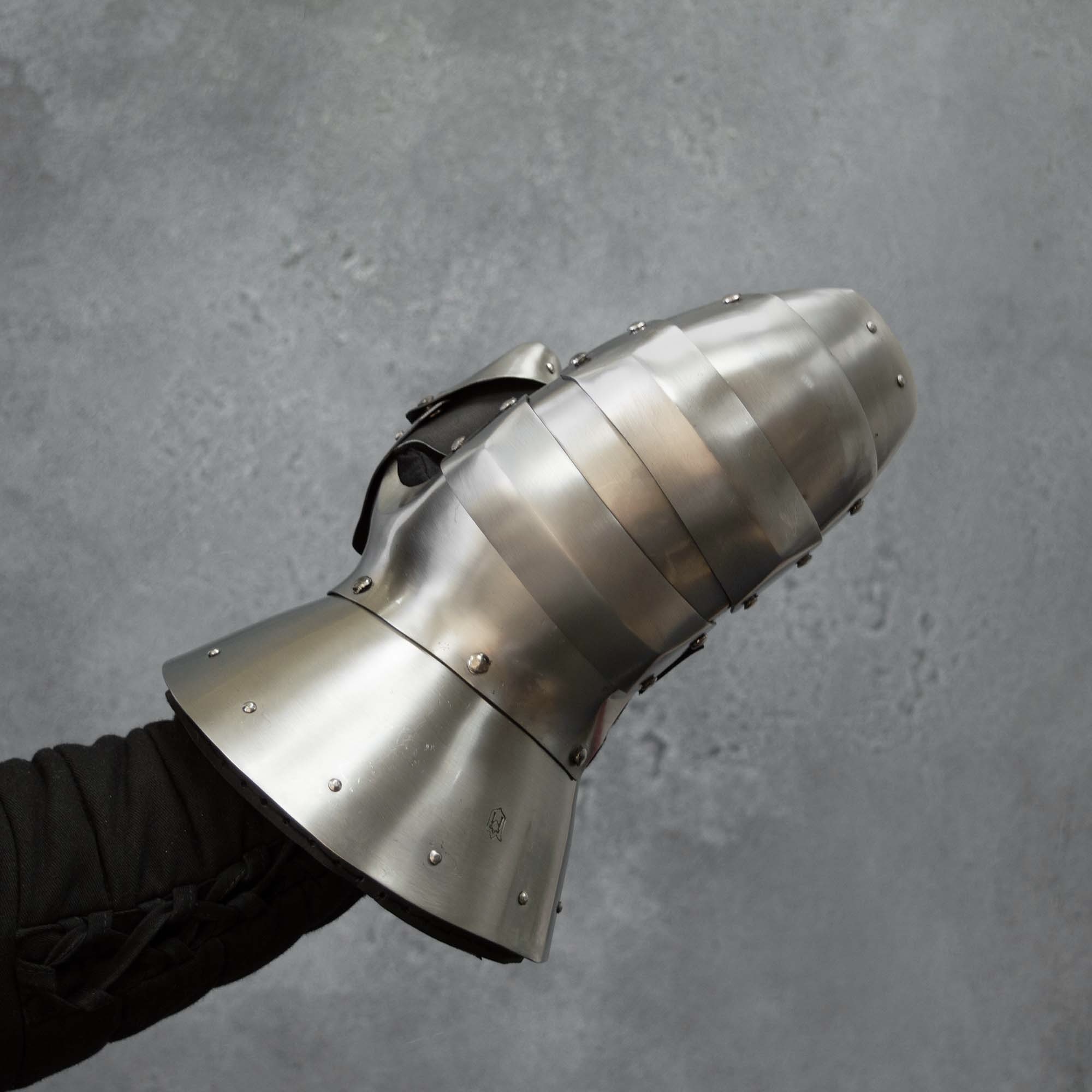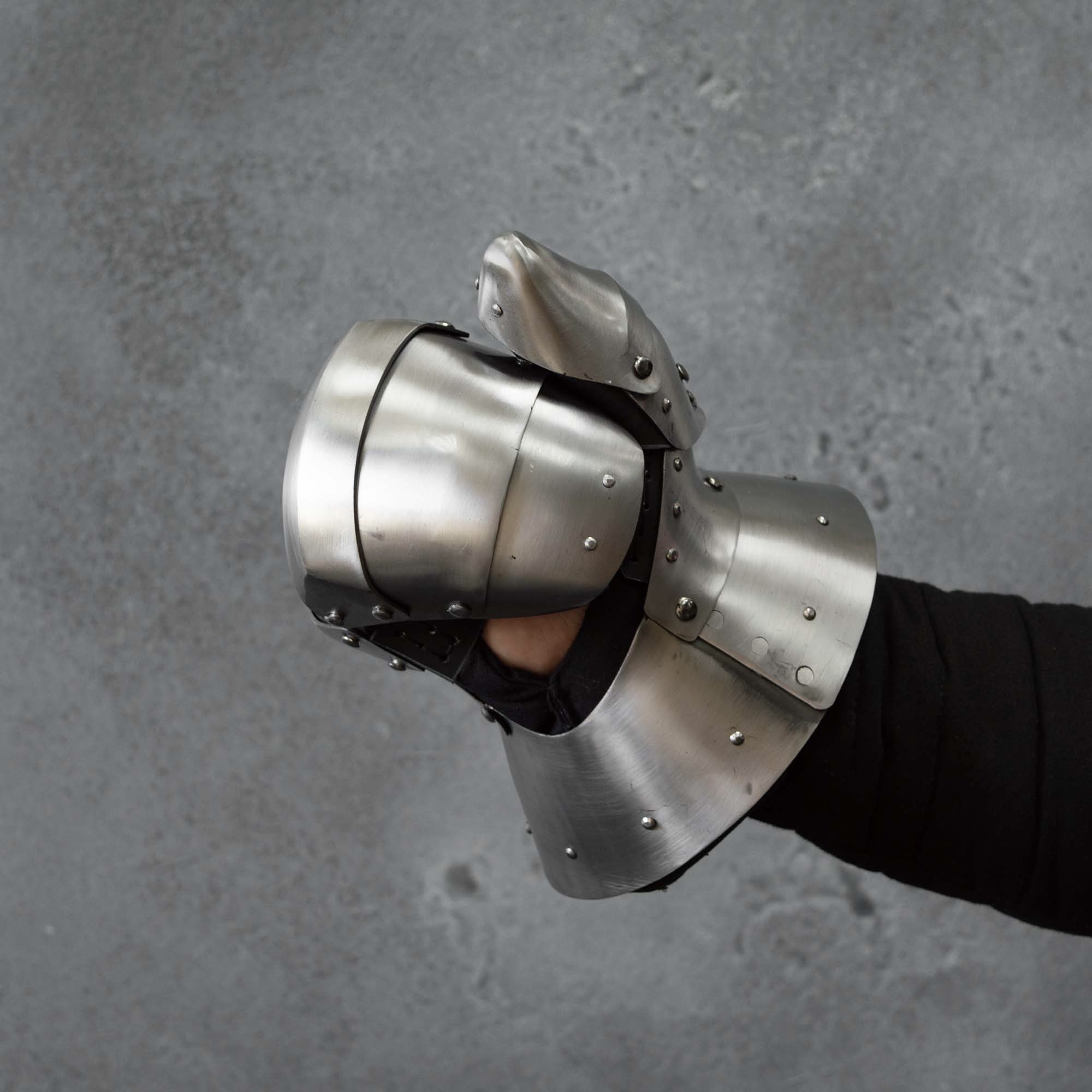That is why it must be protected from all sides. This plate mitten is an excellent solution to this problem. We made it of hardened steel and took into account the features of medieval combat. Fingers are covered by two plates with overlap. This will give them good mobility in combat and keep their hands protected. The thumb is protected by a separate full metal cap, which repeats its shape and will withstand a direct hit with a polearm. Stiffeners are placed on the knuckles, which overlap the plates and fasten them. So you can strike hard with your fist, and do not be afraid that you break your hand. Steel cuff closes the gap between your bracer and glove, no matter how you turn the brush.