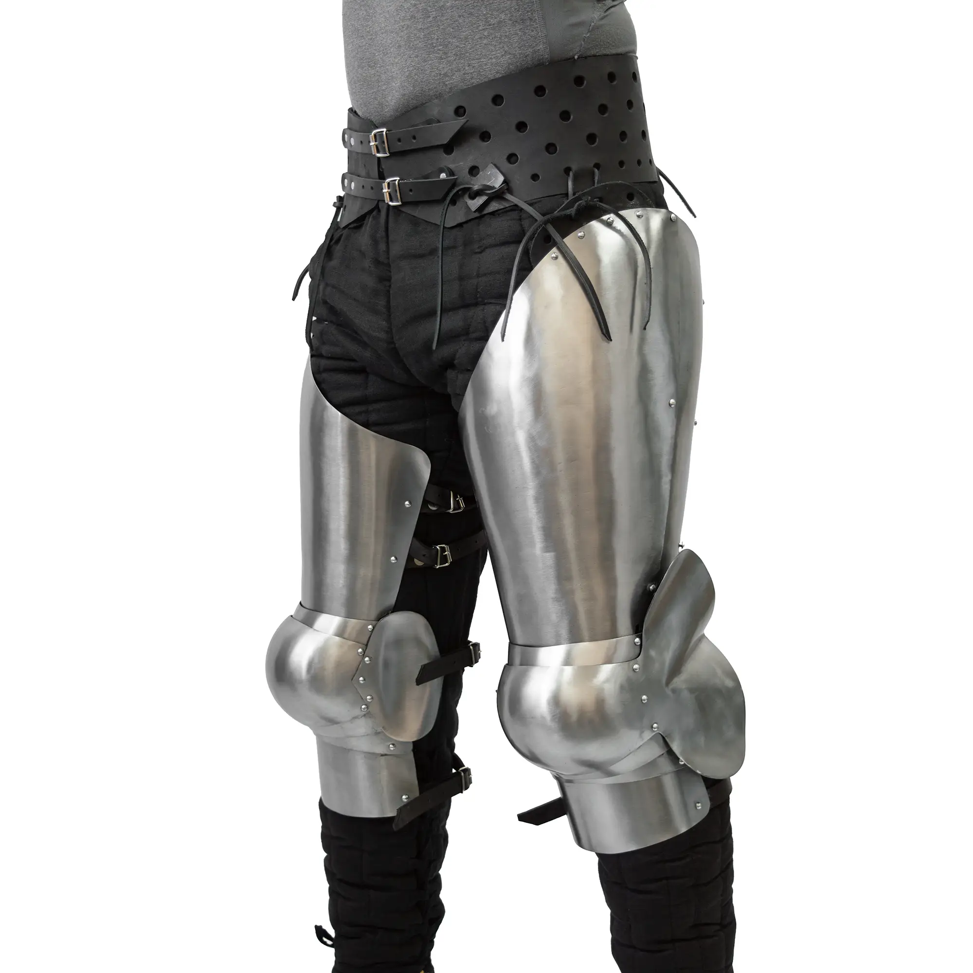 Our cuisses are made with extended back protection to protect the back of your thighs. Unlike other models, this model is anatomically shaped for maximum comfort. The thigh comes with a wide leather stripe on the top and has four holes for easy adjustment to your belt. The knees are made with 2 large side plates to protect your knees from most strikes in buhurt.